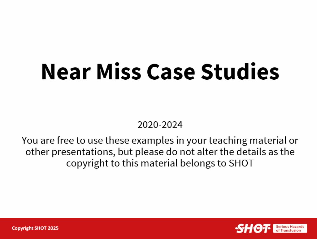 Following a new pilot study in 2009, SHOT re-started the collection and analysis of NM reports in 2010. These NM reports now account for approximately 40% of all reports submitted to SHOT. Reporting and investigating near misses can help to identify and control risks before actual harm results, providing valuable opportunities to improve transfusion safety.