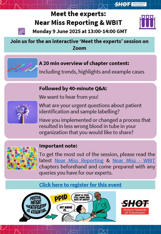 Come and meet the Near Miss Reporting and Wrong Blood in Tube experts for a 1hr session of trends, highlights and Q&A.