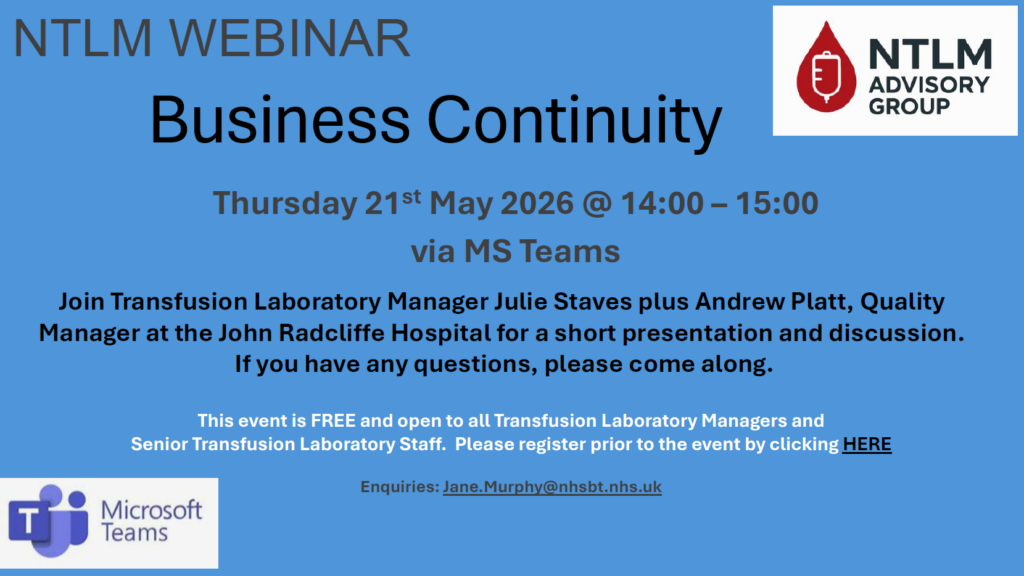 This event is FREE and open to all transfusion laboratory managers and senior transfusion laboratory staff.