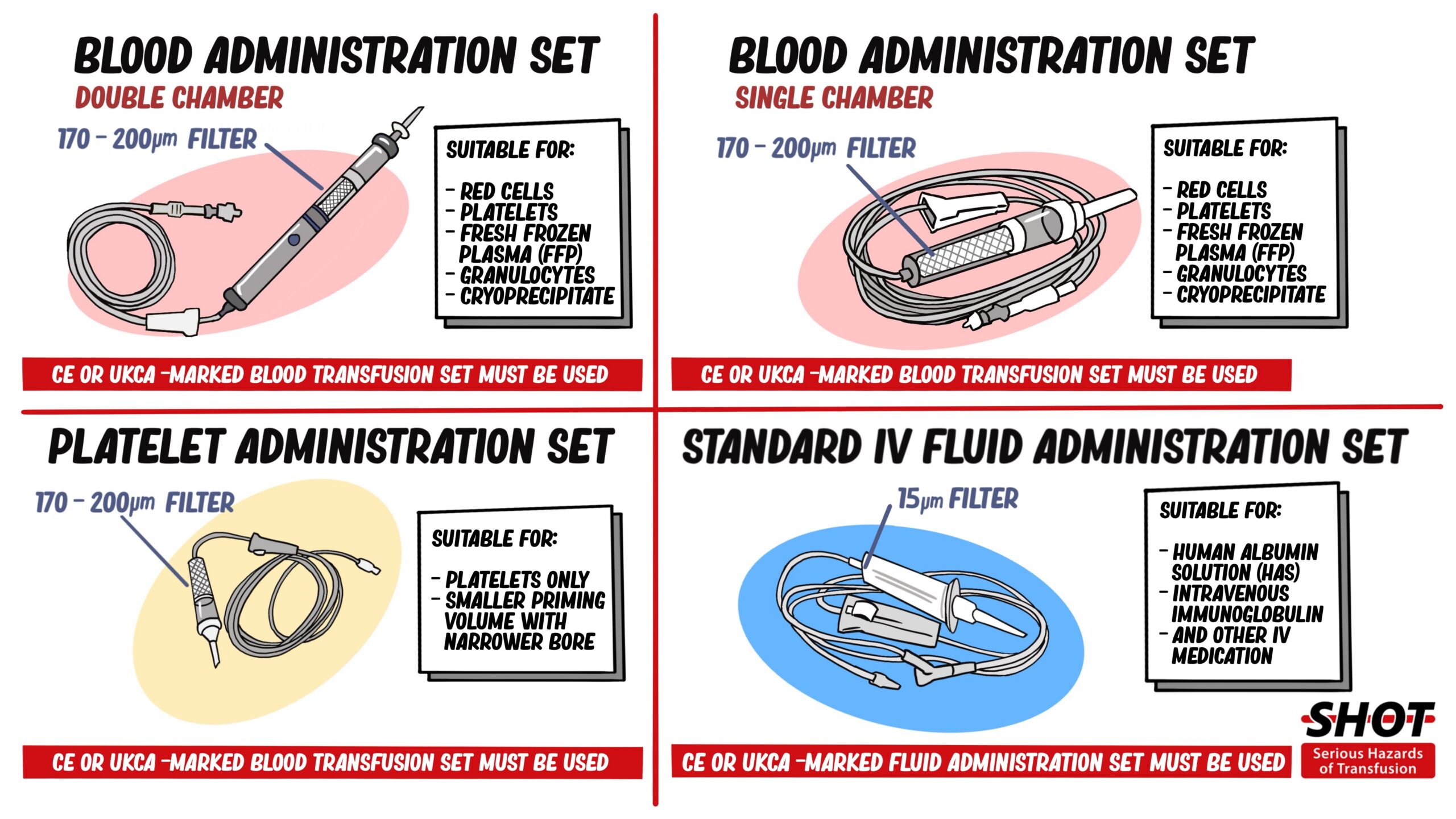 The below poster shows examples of different administration sets (also called giving sets) commonly used for blood components and IV fluid. This poster can be printed and used in conjunction with local policies as a reference tool.