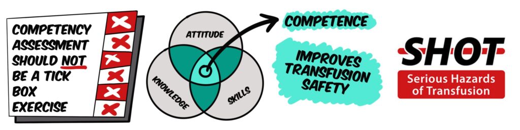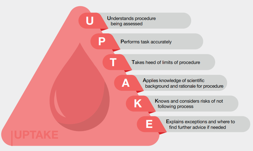 The below competency worksheet was published alongside the 2024 Annual SHOT Report. It was adapted from an example kindly provided by Liverpool Clinical Laboratories, and has been tailored to give a working example in line with the UPTAKE model of competency assessment, first shown in the 2019 Annual SHOT Report and accessible here. The model was created as SHOT reports showed evidence of gaps in knowledge, incomplete training and insufficient competency assessments. Competency assessments should facilitate 2-way discussions that provide an opportunity to learn and seek input from staff being trained.